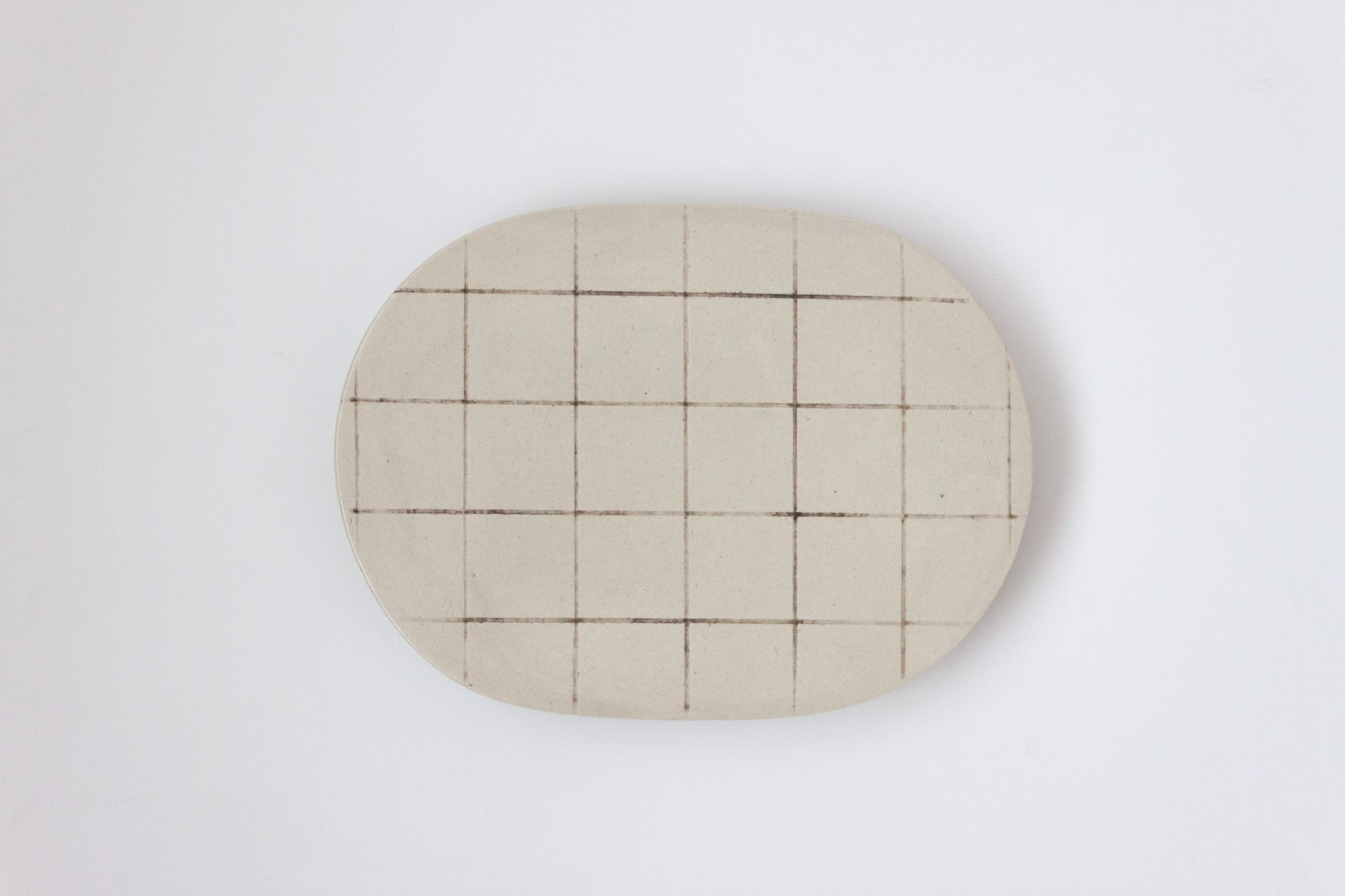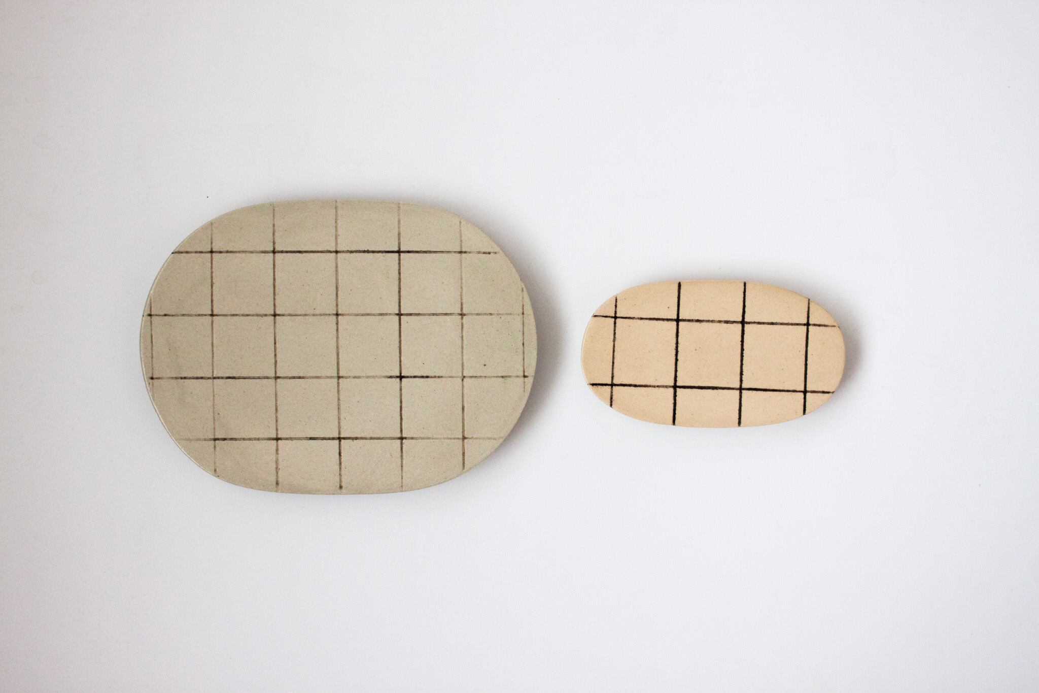 マーブル模様やチェック柄などのお皿やカップなどの実用品も制作。素朴でどこか懐かしい雰囲気の表情を見せる作品を作り出す。