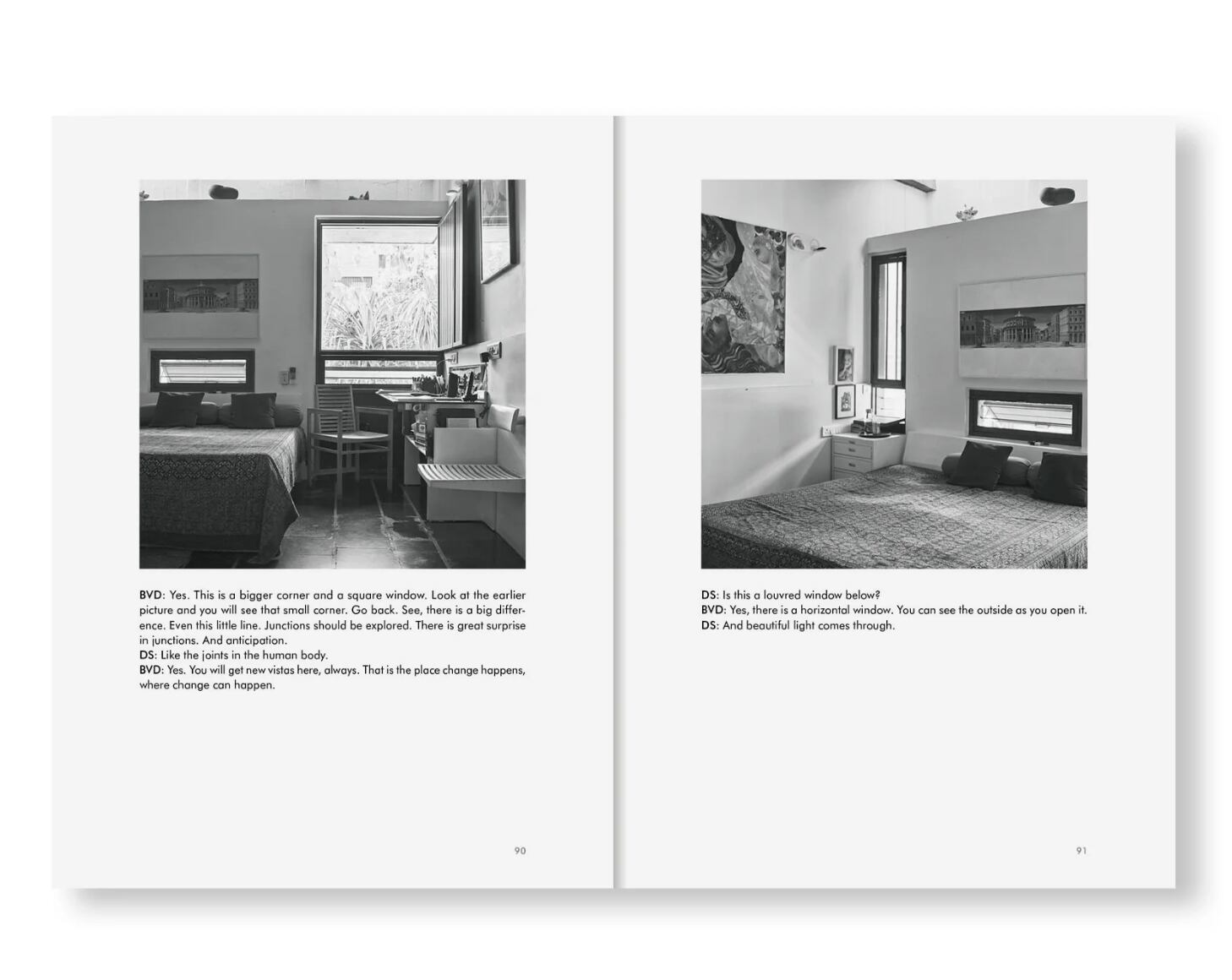 BVドーシの家族で満たされたこの空間のモノクロ・ポートレートとともに、何年にもわたって交わされた2人の会話を紹介する一冊である。コラボレーションのやりとりの中で、BVドーシはダヤニータ・シンの写真に呼応するように、自身の建築における革新的な取り組みの裏に隠された動機を明らかにする。本書の核なる部分は、光、動き、そして住む者を導いていく家の包容力を探ることでもある。家は、彼らを順番に眠りへと誘い落ち着かせることもあれば、会話を弾ませてくれることもある。