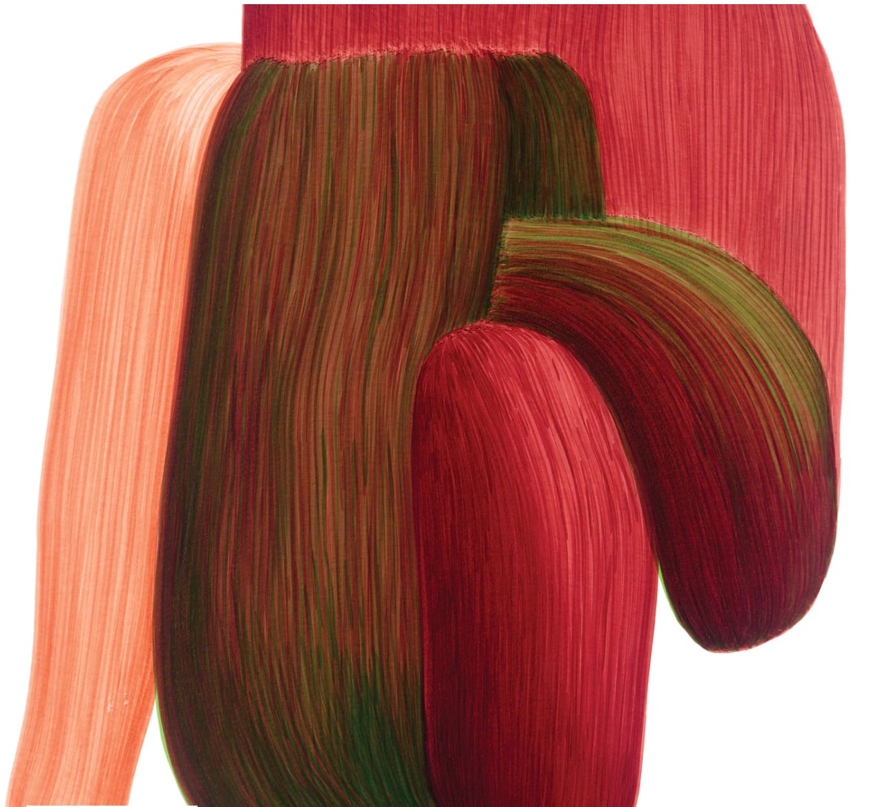 細い線を幾度にも重ねることで構成されており、その線の集積によって有機的な形態や動きが生み出される。視覚的なリズムや感覚的な美しさを重視している点が特徴である。
